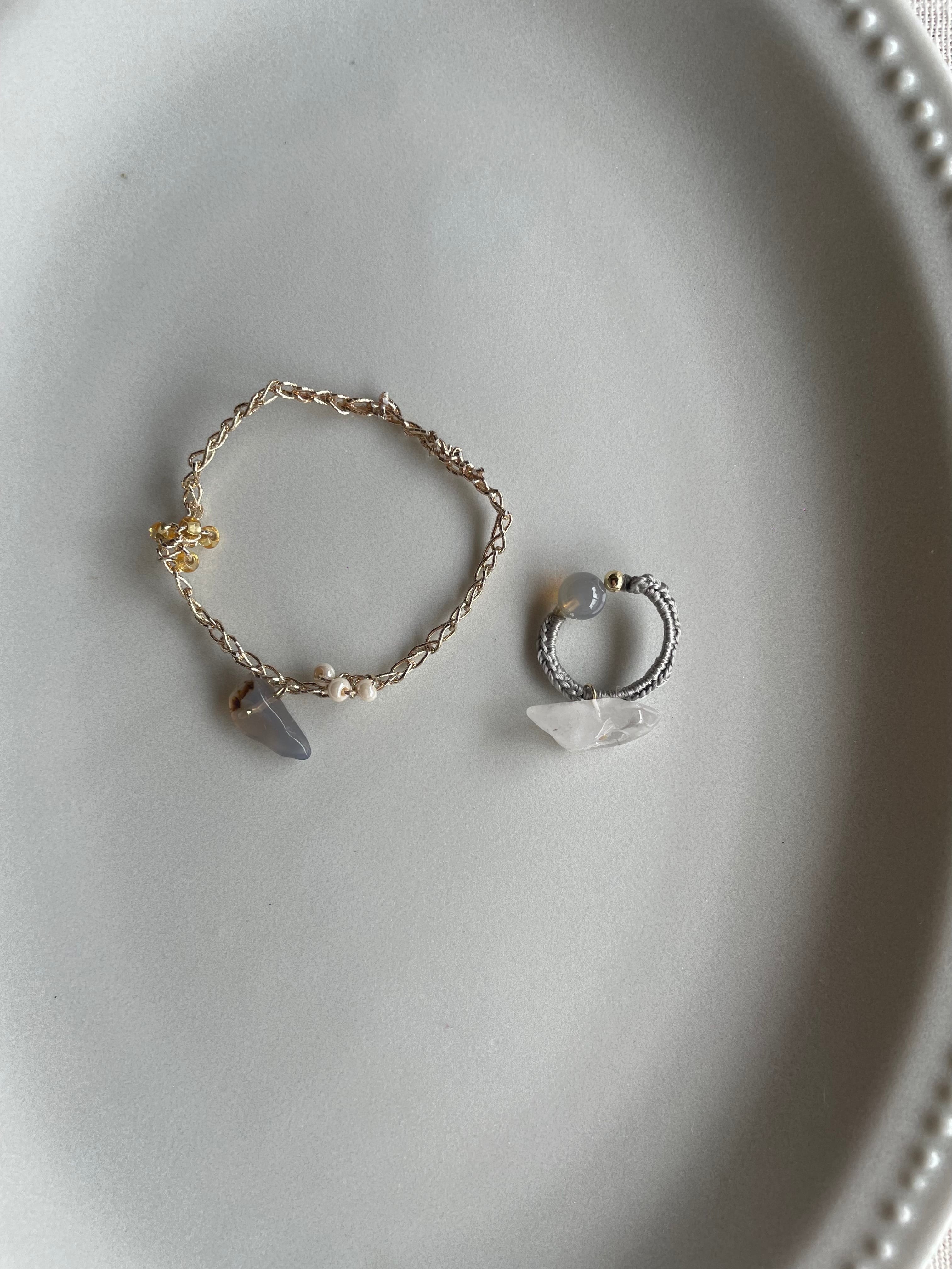 イヤーカフは大ぶりの水晶が揺れるようにつていて単品でお使いになっても存在感があります。